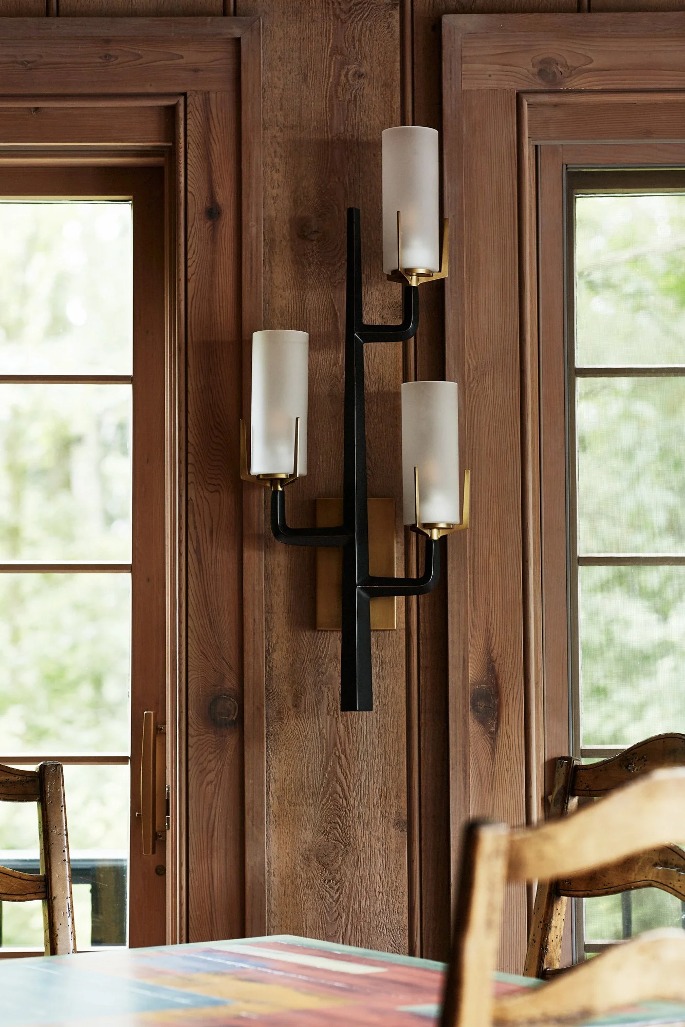 A second family room is arranged with tree-like lamps and cow hide ottoman, hand-selected by Linda to reflect the home’s woodsy charm.