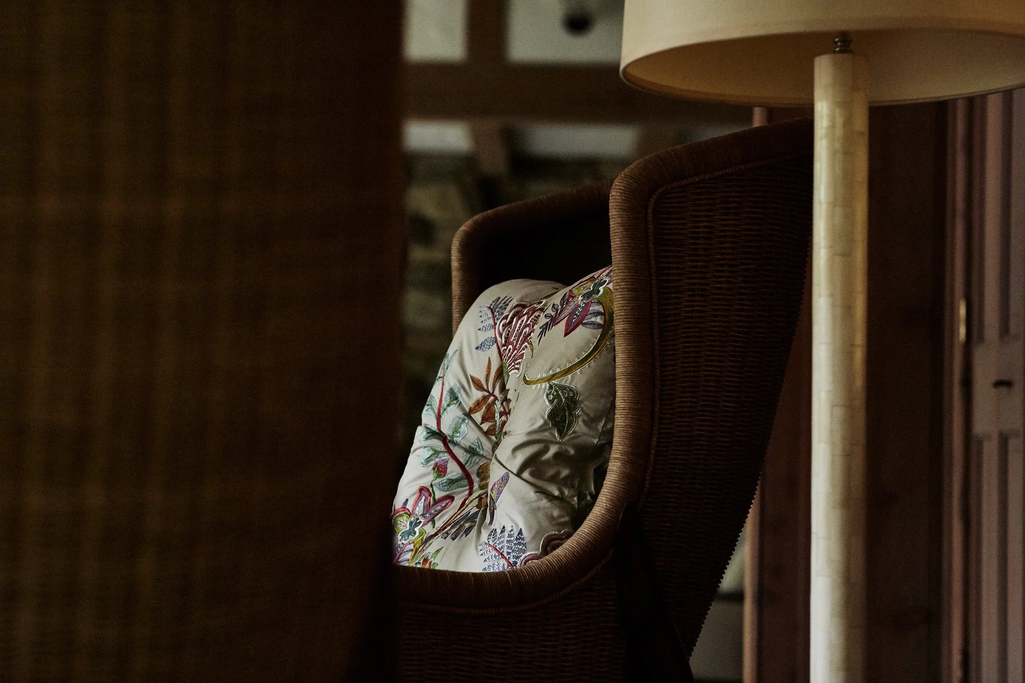 Adjacent lies a four-season sunroom and central gathering space. Linda worked to bring the outside in, with blended furnishing materials and vivid textures, adding new light fixtures and a hanging swing for a cozy vibe.