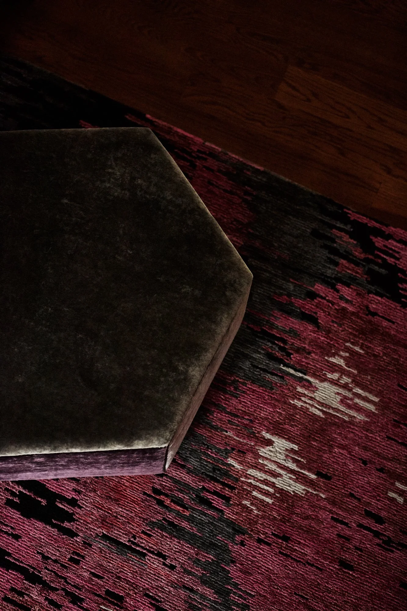 A custom, oversized velvet ottoman and textured rug establish the entryway as an introduction to the bold color palette that resonates throughout the home.